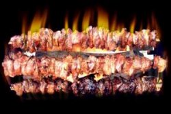 Danach auf die Spieße eines Mutzbratenstandes/grilles aufgezogen und über offenen Birkenfeuer gegrillt, welchem er sein einzigartiges Aroma verdankt.